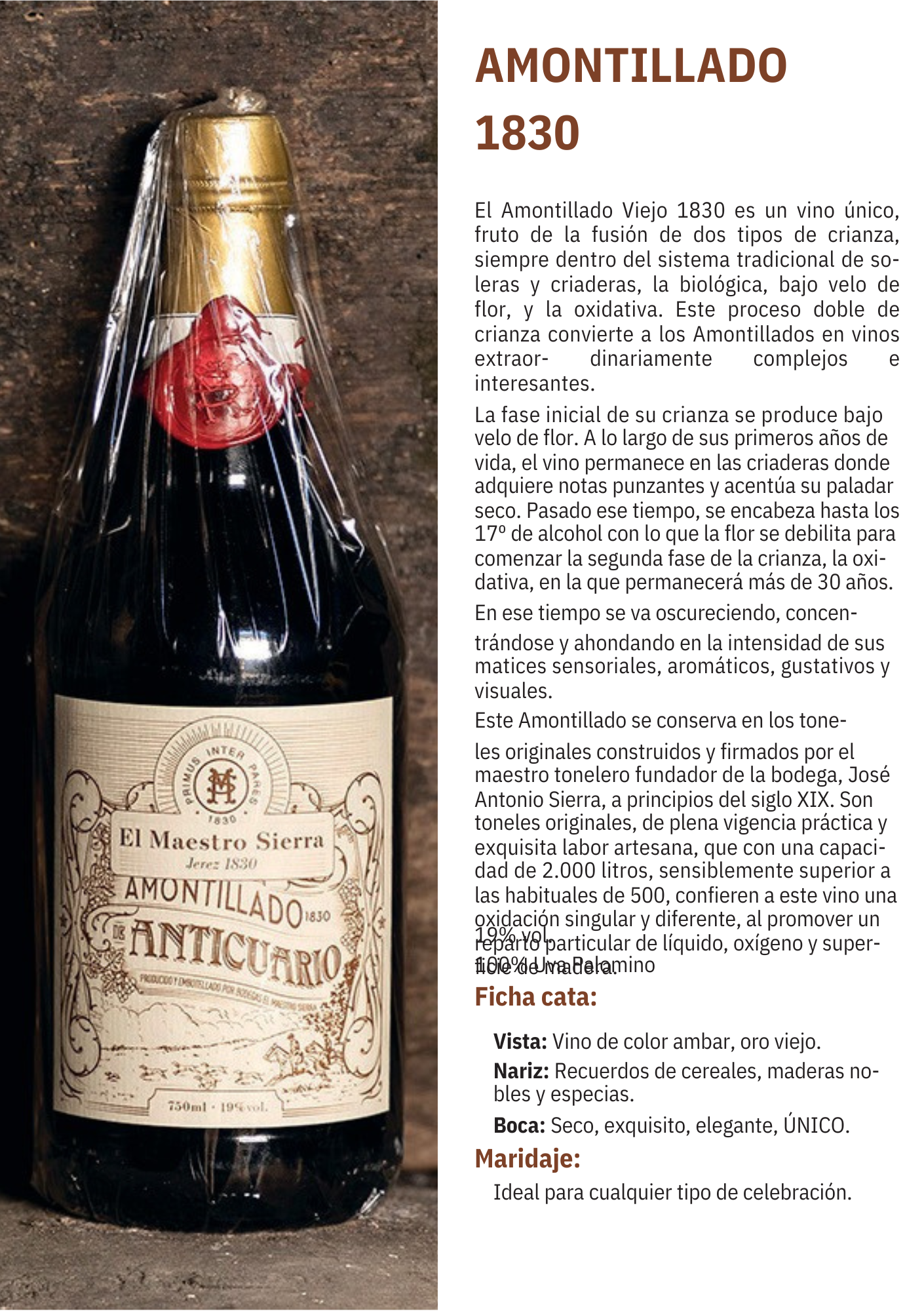 El Amontillado Viejo 1830 es un vino único, fruto de la fusión de dos tipos de crianza, la biológica y la oxidativa.