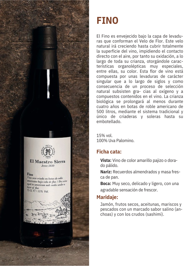 El Fino es envejecido bajo la capa de levaduras que conforman el Velo de Flor. Este velo natural irá creciendo hasta cubrir totalmente la superficie del vino, impidiendo el contacto directo con el aire, por tanto su oxidación, a lo largo de toda su crianza, otorgándole características organolépticas muy especiales, entre ellas, su color. Esta flor de vino está compuesta por unas levaduras de carácter singular que a lo largo de siglos y como consecuencia de un proceso de selección natural subsisten gracias al oxígeno y a compuestos contenidos en el vino.